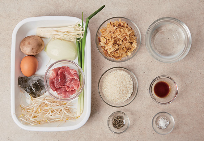 가다랑어포(10g), 돼지고기(100g), 양파(30g), 표고버섯(1개), 팽이버섯(20g), 쪽파(10g), 달걀(1개), 쌀(90g), 숙주(50g) 밑간 소금(1g), 후춧가루(1g)