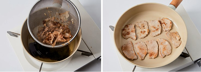 ② 돼지고기는 소금과 후춧가루로 밑간을 한 뒤 굽는다.