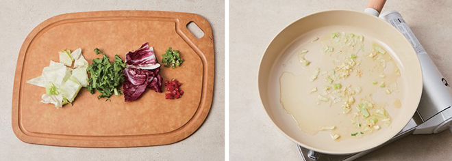 ① 양상추와 그린 치커리, 라디치오는 먹기 좋은 크기로 찢고, 고추는 잘게 다진다.