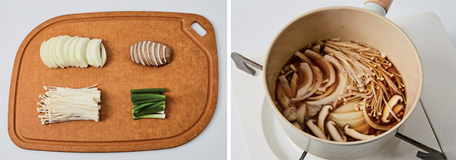 ④ 육수에 저염간장을 넣어 한소끔 끓이다가 양파와 버섯을 넣고 끓인다.