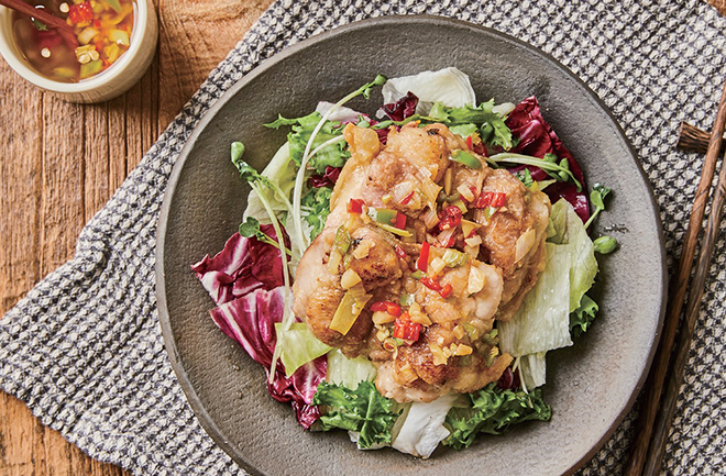 닭다리살(110g), 양상추(25g), 그린 치커리(5g), 라디치오(5g), 홍고추(5g), 청양고추(5g), 대파(5g), 무순(3g), 마늘(1g), 생강(1g), 식용유(3g)