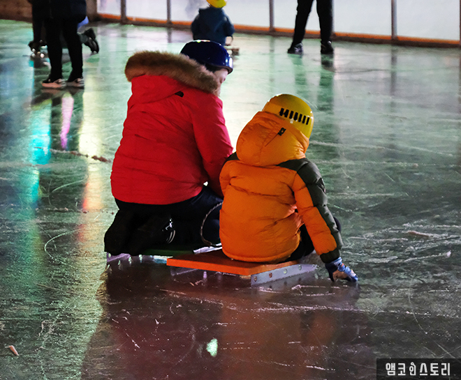 낮은 기온과 매서운 바람에도 아랑곳하지 않는 시민들의 질주가 빙판을 가릅니다. ‘누가 누가 빨리 가나’ 내기에 들뜬 기운이 조바심을 감추지 못하고 부정 출발을 감행하자 여기저기 빗발치는 컴플레인은 웃음꽃이 함께해요. 손을 꼭 잡고 이인삼각을 펼치고 있는 연인들의 행보도 눈에 띄고, 잔뜩 허리를 굽힌 채 아이와 눈높이를 맞추며 조심스러운 질주를 이어가는 젊은 부모의 모습도 인상적입니다. 새하얀 빙판 위로 새겨지는 각양각색 모습들, 메인 스케이트장 옆에 조성된 썰매장에도 어린아이들의 웃음소리가 가득합니다.