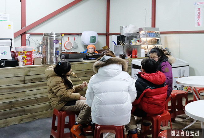 금강산도 식후경! 몸을 불살랐더니 슬슬 출출함이 밀려옵니다. 화도진 스케이트장 매점에서 간단한 요기를 하기로 해요. 어묵, 우동, 떡볶이, 닭꼬치, 주먹밥, 핫바, 라면 등이 합리적인 가격대로 구비되어 있는데요, 제대로 된 한 끼 식사를 원한다면 인근 송현시장과 수문통의 먹거리 탐방을 추천해요.