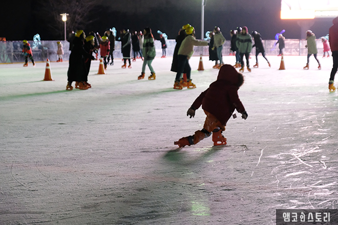 낮은 기온과 매서운 바람에도 아랑곳하지 않는 시민들의 질주가 빙판을 가릅니다. ‘누가 누가 빨리 가나’ 내기에 들뜬 기운이 조바심을 감추지 못하고 부정 출발을 감행하자 여기저기 빗발치는 컴플레인은 웃음꽃이 함께해요. 손을 꼭 잡고 이인삼각을 펼치고 있는 연인들의 행보도 눈에 띄고, 잔뜩 허리를 굽힌 채 아이와 눈높이를 맞추며 조심스러운 질주를 이어가는 젊은 부모의 모습도 인상적입니다. 새하얀 빙판 위로 새겨지는 각양각색 모습들, 메인 스케이트장 옆에 조성된 썰매장에도 어린아이들의 웃음소리가 가득합니다.