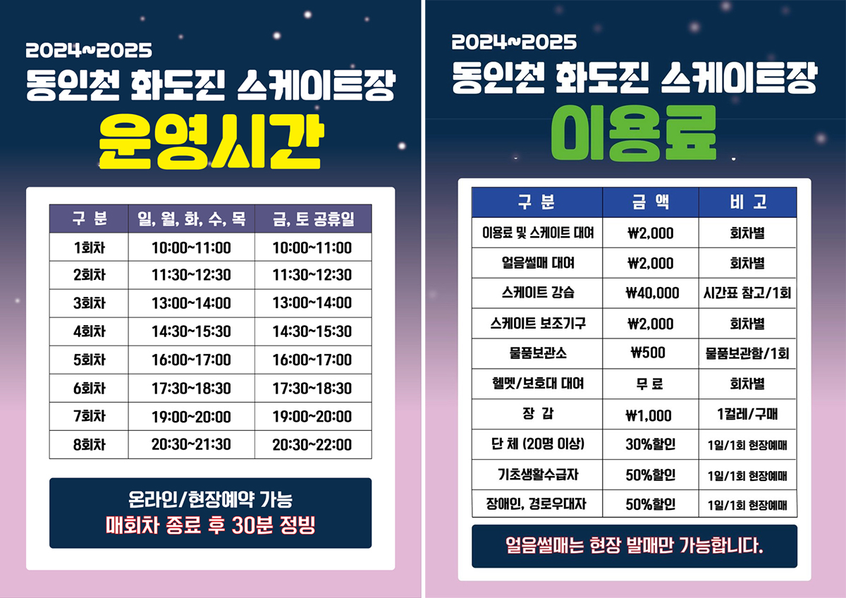 여기서 잠깐! 몰려드는 인파로 복잡한 현장에서 기다림 없는 패스트 패스의 꿀팁을 알려드려요. 바로 네이버 예약을 이용하는 거예요. 이용일 최소 하루 전 예매는 필수로, 회차별로 티켓 구매가 가능하며 이용료 2,000원에 기본장비(헬멧과 보호대)가 포함되어 있어요. 장갑은 개별 지참으로 미착용 시 입장이 불가하니 유의해야 해요. 물론, 현장 구매도 가능하답니다. 그 외 얼음 썰매(2,000원)와 스케이트 강습(40,000원)도 해당 사이트를 통해 예매할 수 있어요. 초보의 경우 보조 기구 사용도 추천해요.