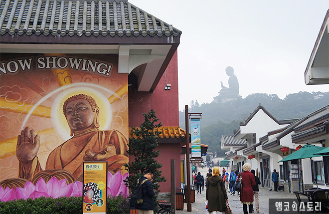 케이블카에서 내리면 중국의 어떤 시골 마을처럼 골목길이 나오고, 길의 건물에는 기념품 가게들이 늘어서 있다. 아니, 이런 곳에까지 스타벅스가 있다니! 안개도 끼고 날씨도 으슬으슬하여 몸도 녹일 겸 스타벅스로 들어가 쿠키와 차, 커피로 원기 충전 후 불상을 보러 간다.