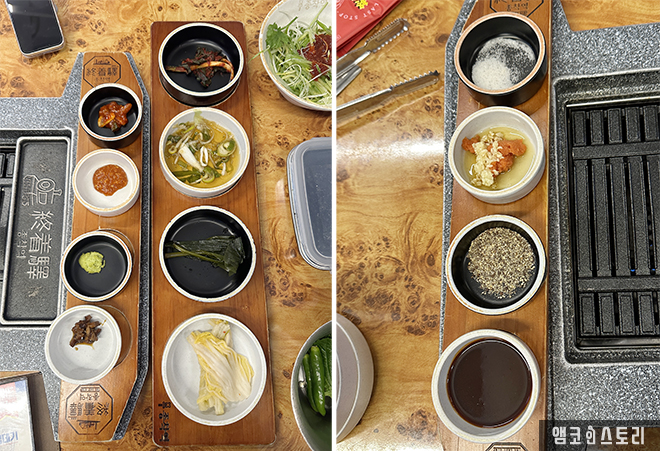 우선, 소금구이와 삼겹살을 주문했습니다. 이 두 가지가 첨단 <종착역>의 베스트 메뉴랍니다. 주문 후 기본 찬들이 나옵니다. 기본 찬들도 종류가 각양각색입니다. 소스 종류들도 많더라고요. 셀프 바도 있어서 반찬들을 부족하지 않게 먹을 수도 있어서 엄지척입니다.
