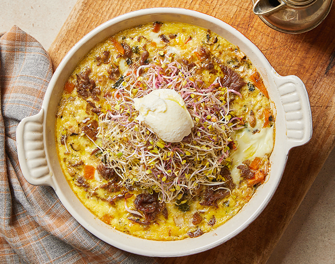 ⑤ 140℃로 예열한 오븐에 25분 정도 프리타타 위에 새싹 채소와 리코타를 구워 프리타타를 만든다.