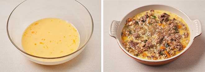 ④ 타르트 틀에 식용유(6g)를 바르고 볶은 채소, 소고기를 올리고 ③을 넣는다.
