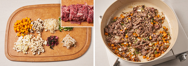 ② 팬에 소고기 양지를 구운 뒤 꺼내고, 같은 팬에 식용유를 두르고, 다진 마늘과 손질한 채소를 넣고 물기가 없어질 때까지 볶는다.