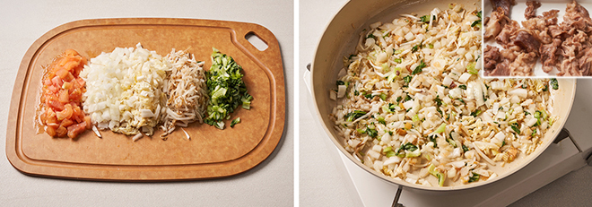① 껍질을 벗긴 토마토는 주사위 모양으로 썰고, 양파, 배추, 청경채, 숙주는 잘게 썬다.