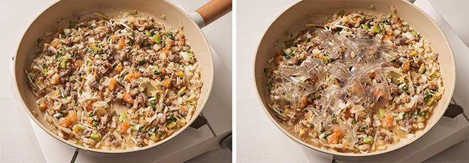 ④ 당면은 6cm 길이로 잘라 끓는 물에 7분간 삶아 ③에 넣는다.
