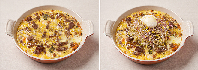 ⑤ 140℃로 예열한 오븐에 25분 정도 프리타타 위에 새싹 채소와 리코타를 구워 프리타타를 만든다.
