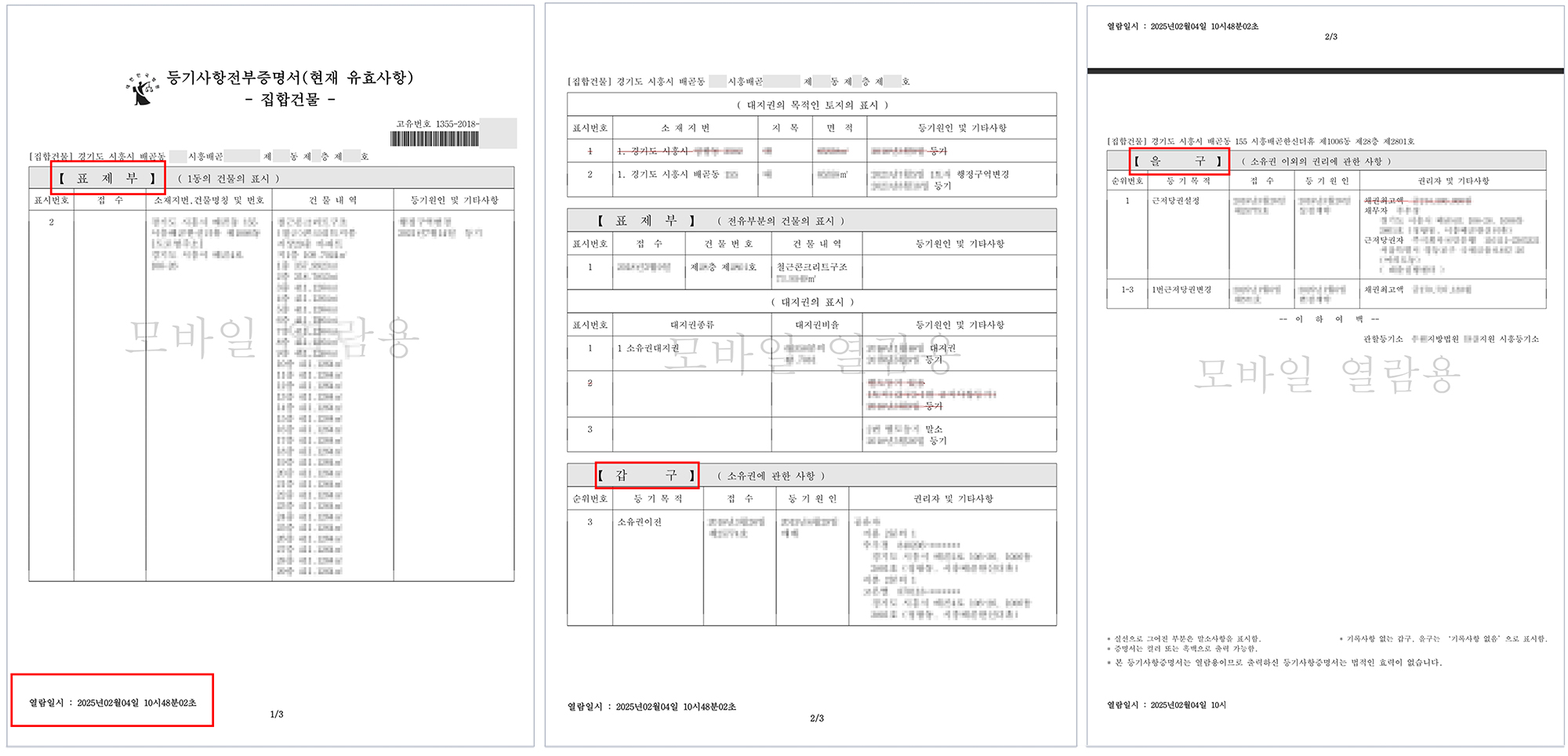먼저, 중요한 사항은 서류의 좌측 하단에 ‘열람일시’가 표시되어 있다는 점입니다. 권리 관계는 실시간으로 변동될 수 있으므로 계약 전 즉시 열람 서류가 가장 정확하기에 열람일시를 꼭 확인하기 바랍니다.
