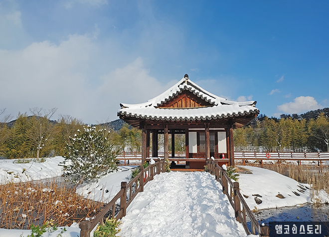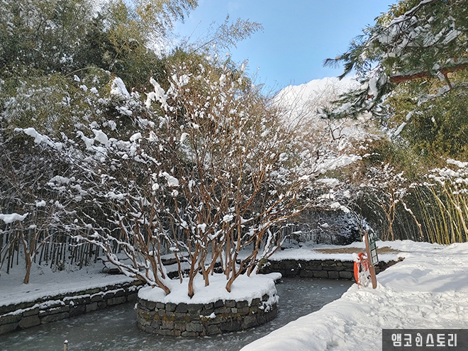 담양 죽녹원의 가사문학촌에는 눈꽃이 활짝 피어 설국의 아름다운 풍경을 자랑합니다. 눈 덮인 대나무숲과 원림의 정자를 거닐며 겨울의 차분함과 설경의 아름다움을 만끽해 봅니다.