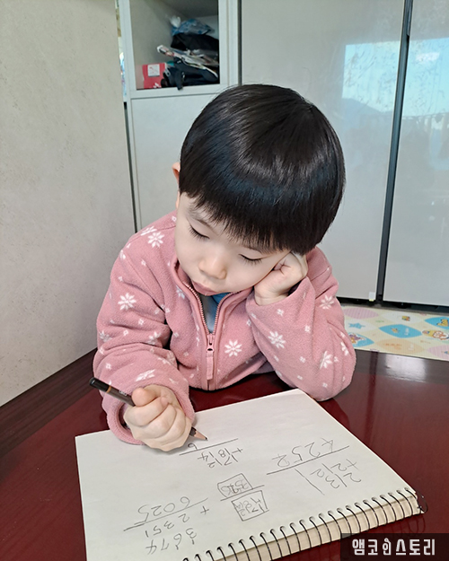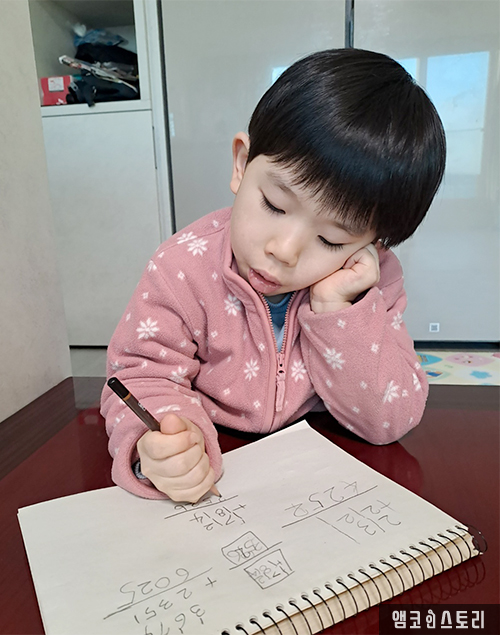 유치원 입학을 앞둔 손자가 산수 문제를 풀고 있다.