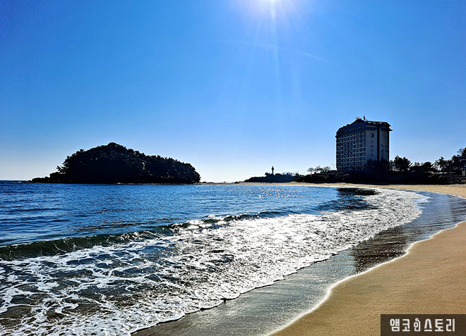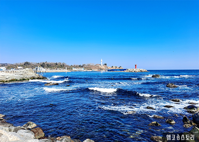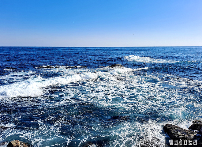 파란 양탄자 위에 뿌려 놓은 다이아몬드처럼 눈부시게 빛나는 윤슬의 아름다움에 취해, 잠시 넋을 잃고 걸음을 멈춥니다. 언제나 동해는 피곤에 지친 우리의 영혼을 회복시키는 매력이 있습니다. 이제 이별해야 할 겨울바다를 위해 마지막 몸부림을 치는 것인지, 일렁이는 파도가 오늘따라 유난히 거칠어 보입니다.
