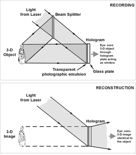 간섭이 일어나면, 같은 위상일 경우 보강 간섭으로 더 강해지게 되고, 두 개의 빛이 반대 위상을 가지면 서로 상쇄되어 상쇄간섭이 이루어지게 됩니다. 이 두 현상이 반복되면서 밝고 어두운 연속적인 간섭무늬가 생기게 됩니다. 기준파와 물체파의 간섭으로 새겨진 그 간섭무늬에 정보를 새겼던 홀로그램 판에 똑같은 빛을 통과시켜주면 반사되었던 물체가 3D 이미지로 똑같이 나타나게 되는 것입니다.