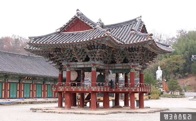 경내 한 가운데 우뚝 솟은 종루(보물 제1244호)는 화려한 장식이 눈길을 사로잡아요. 열두 개의 기둥을 사용한 2층의 누각 형태로 지붕 및 내부 구성이 여타의 사찰에서는 보기 드문 십자형 구조를 가져요. 조각의 섬세함이 단연 뛰어난 미감을 완성하는 종루 내부에는 유형문화재 제138호로 지정된 범종을 중심으로 목어, 운판, 법고를 봉안하고 있답니다.