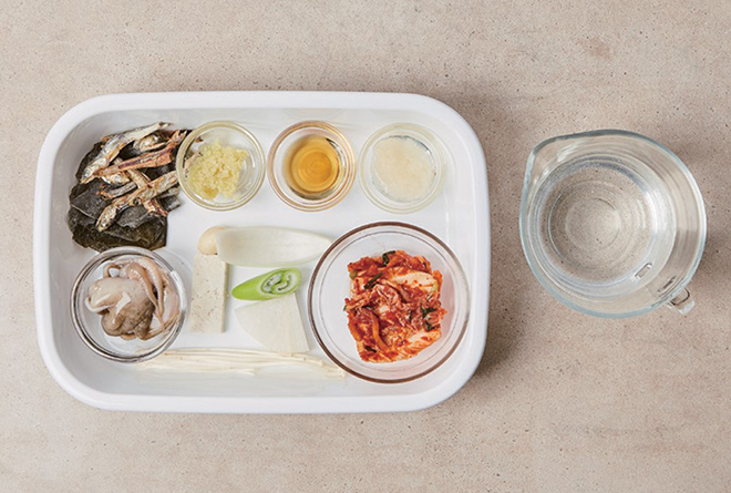 주꾸미(40g), 김치(40g), 무(10g), 마늘(3g), 대파(3g), 양파(10g), 두부(10g), 참기름(3g), 배즙(10g), 팽이버섯(3g) 육수 재료 다시마(5g), 멸치(10g), 물(300g)