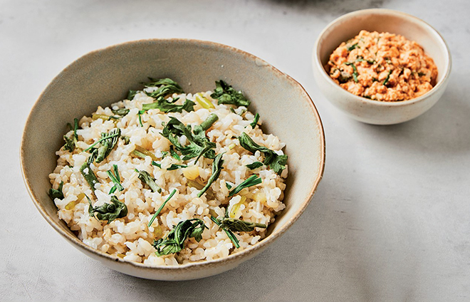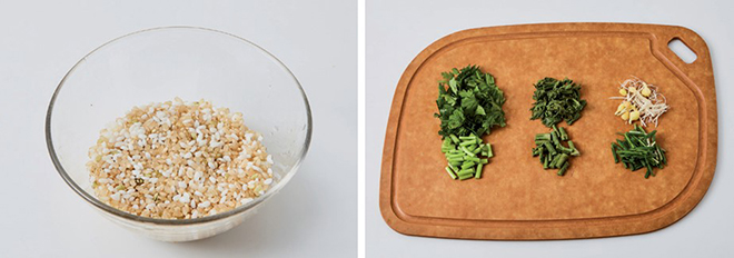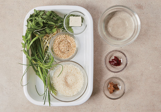 현미(30g), 멥쌀(60g), 쑥갓(20g), 달래(10g) 두부 양념장 고추장(5g), 된장(5g), 다시마 육수(60g), 두부(15g)