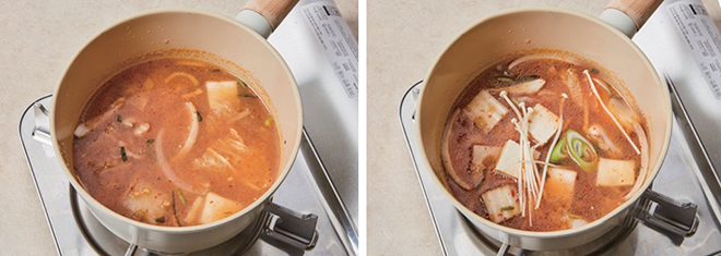 ⑥ 두부, 팽이버섯을 넣고 한소끔 끓여 마무리한다.