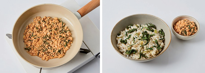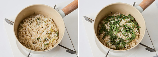 ③ 쑥갓과 달래의 줄기 부분은 불린 쌀과 함께 냄비에 넣고, 밥물을 맞춰 센 불에서 끓어오르면 중약 불로 줄여 밥을 15분간 짓는다.