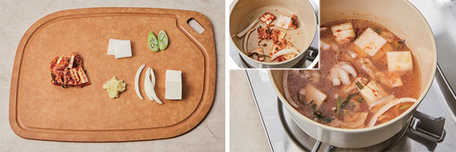 ③ 김치는 국물을 꽉 짜서 한입 크기로 썰고, 무는 편 썰고, 마늘은 다지고, 대파는 어슷 썰고, 양파는 굵게 채 썰고, 두부는 납작하게 썬다.