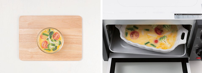 방울토마토 20g, 양파 5g, 브로콜리 10g, 그린빈스 10g, 계란 80g, 파마산치즈 3g, 생크림 20g, 마늘 0.1g, 후추 0.1g
