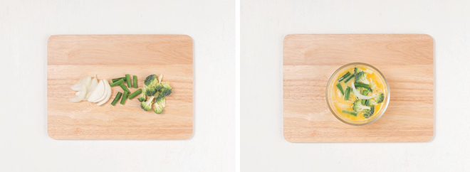 ③ 양파는 채 썰고, 브로콜리는 깍둑 썰고, 그린빈스는 2cm 길이로 자른다.