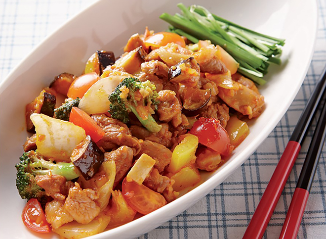 오리고기(120g), 가지(25g), 양파(20g), 파프리카(20g), 새송이버섯(10g), 브로콜리(25g), 부추(7g), 방울토마토(15g)