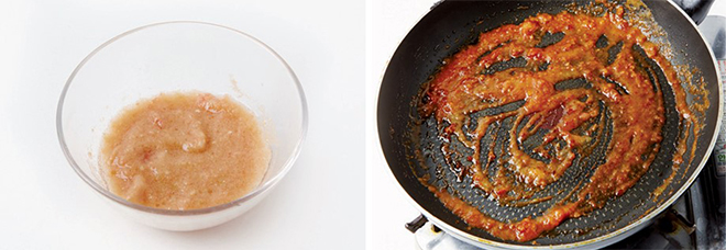 ④ 팬에 기름을 두르고 다진 마늘을 넣고 볶다가, 고추장과 갈아놓은 토마토, 양파, 풋고추와 물엿을 넣고 볶으면서 농도를 맞춰 토마토고추장소스를 만든다.