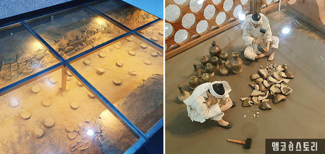 박물관 한켠에는 녹청자의 제작 과정을 재현한 코너가 마련되어 있습니다. 흙을 다듬고, 빚고, 유약을 입히고 가마에 구워내는 전 과정을 상세히 소개하여 그 복잡하고 섬세한 과정을 직접 확인할 수 있습니다. 왜 녹청자가 왜 특별한지, 왜 오랜 시간 사랑받아왔는지 자연스럽게 이해되는 순간이에요. 특히 사적 제211호로 지정된 경서동 녹청자요지에서 발굴된 유물들도 함께 전시되어, 세월을 넘어 전해지는 도공들의 숨결을 더욱 깊이 있게 만나볼 수 있습니다.