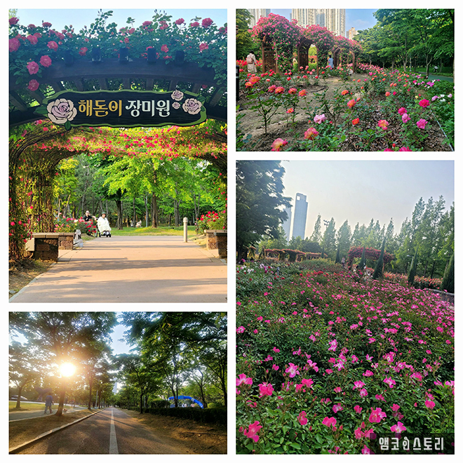 흐드러지게 핀 장미꽃을 쫓는 눈,