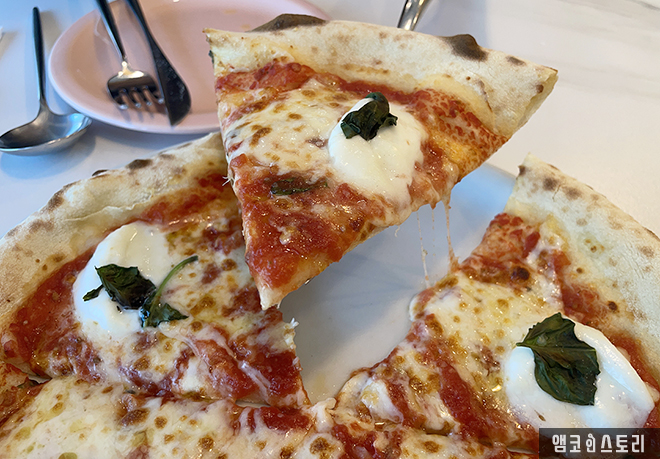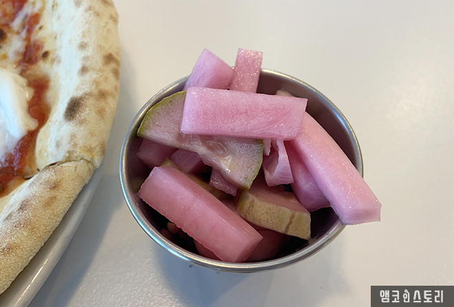 메인 메뉴인 마르게리타 디 부팔라 피자인데요, 바질, 토마토 소스, 모차렐라 치즈, 프레쉬 버팔로 치즈를 넣어 만든 화덕 피자입니다. 필자가 생각하는 화덕피자의 장점은 바로 쫄깃한 식감인데요, 높은 온도에서 짧은 시간에 구워져 겉은 바삭하고 속은 촉촉한 것이, 질리지 않고 계속 손이 갑니다. 테라코타의 화덕피자는 특히 불향이 은은하게 배어 풍미가 깊고 재료 본연의 맛이 잘 살아나는 것이 특징입니다. 조금 맛이 물릴 때는 같이 나오는 핑크색 피클을 곁들이면 말끔히 해소됩니다.
