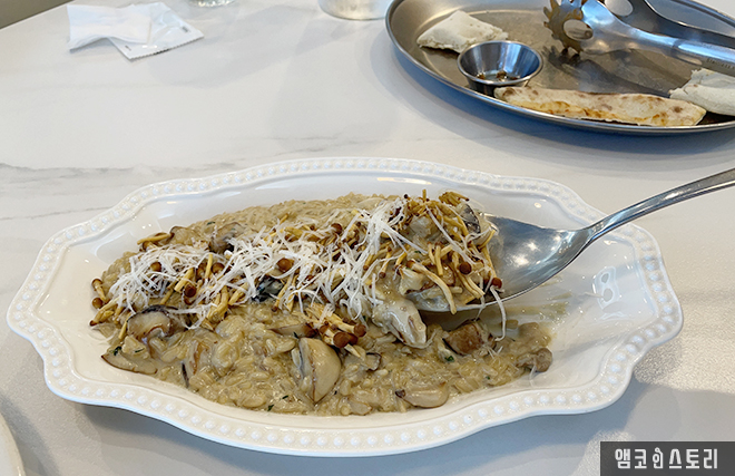 마지막 메뉴인 풍기 리조또가 나왔습니다. 메인으로 포르치니 버섯이 들어있고, 트러플 향과 함께 이태리 쌀을 제대로 맛볼 수 있는 리조또입니다. 양이 꽤 푸짐해서 배가 고플 때 주문하기 좋은 것 같습니다.