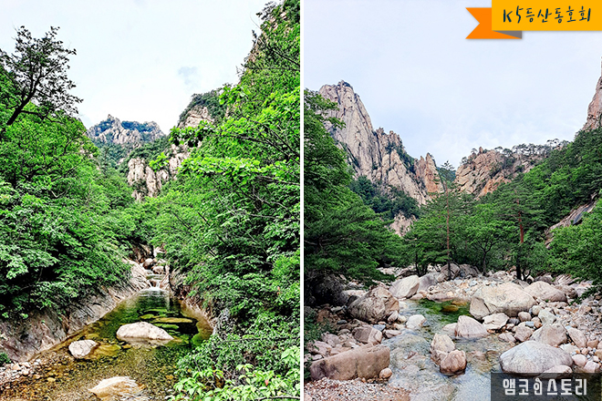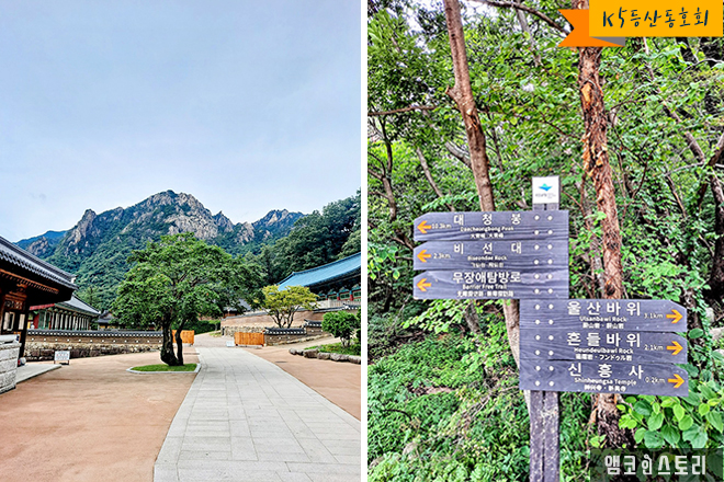 신흥사에서 갈림길이 나와 선택을 해야 합니다. 오른쪽으로 가면 누구나 한 번쯤은 들어봤을 법한 <흔들바위-울산바위> 코스가 나옵니다. 여기도 당일치기 초보 산행자들에게 아주 좋은 코스이고 멋진 곳입니다. 왼쪽으로 가면 오늘 우리가 가야 할 <비선대-천불동 계곡-대청봉> 코스입니다.