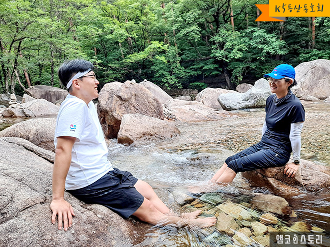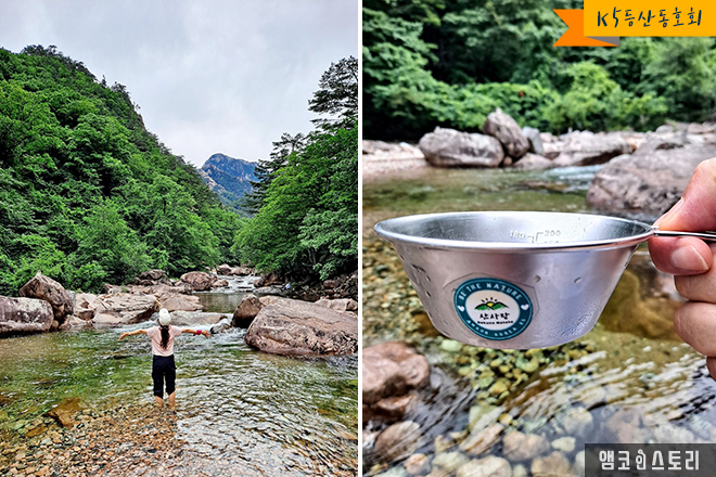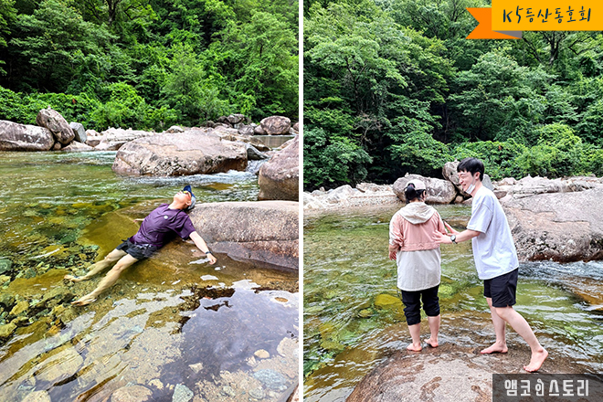 여름철 계곡 트레킹의 묘미는 아무래도 이런 맑고 시원한 계곡에서의 물놀이가 아닌가 싶습니다. 더운 날씨와 밀림을 걷는 듯한 엄청난 습도, 땀과 더위를 식힐 수 있는 청정 1급수 계곡은 여름철 계곡 트레킹을 즐기는 사람들만의 특권이겠지요. 이곳에서 각자가 준비한 간식과 음료로 담소도 나누고 물놀이도 잠시 즐겨봅니다. 여름 산행 또는 트레킹이 주는 낭만을 오늘 제대로 경험하고 갑니다.