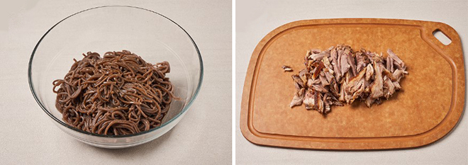 ③ 메밀면을 4분간 삶아 물기를 제거한 후, 참기름과 간장을 넣어 버무린다.