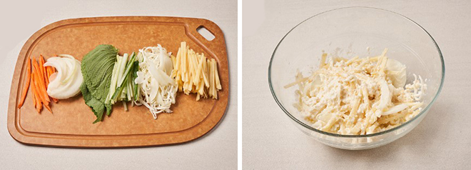 ① 당근, 양파, 깻잎은 깨끗이 씻고, 오이, 양배추, 사과는 채썬다.