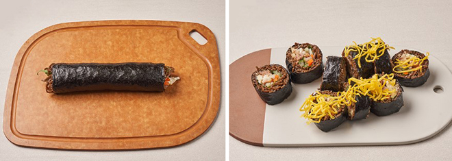 ⑥ 김밥을 먹기 좋은 크기로 썰고, 달걀 지단을 올려 마무리한다.