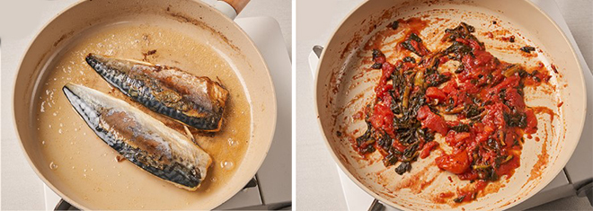 ④ 고등어를 구운 팬에 남은 기름을 이용해 시래기를 볶고, 토마토 홀을 넣고 주걱으로 으깬다.