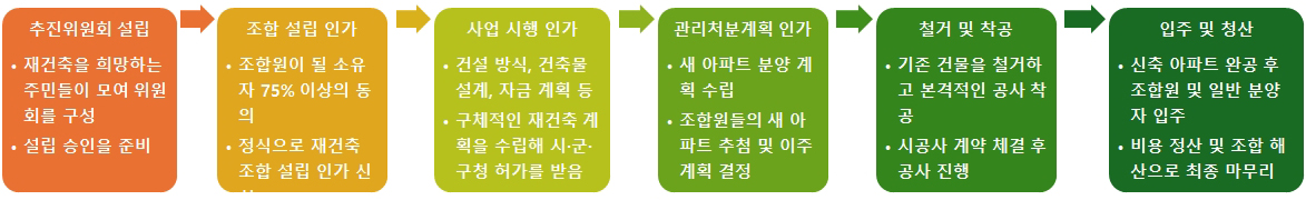 재건축을 희망하는 주민들이 모여 위원회를 구성합니다. 시와 구청의 설립 승인을 받아 추진위원회가 설립됩니다. 조합원이 될 소유자 75% 이상의 동의를 얻어 정식으로 재건축 조합 설립 인가 신청을 하여 조합 설립 인가를 받습니다. 건설 방식, 건축물 설계, 자금 계획 등 구체적인 재건축 계획을 수립해 시, 군, 구청 허가를 받아 사업시행 인가를 받게 됩니다. 새 아파트 분양 계획 수립하고 조합원들의 새 아파트 배정 및 이주 계획 결정하는 관리처분계획이 인가됩니다.