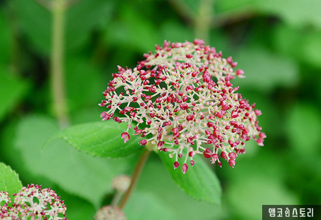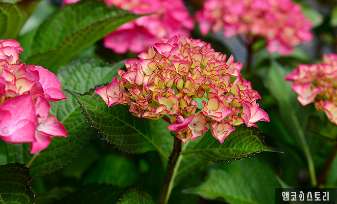 송이가 탐스러워 결혼식용 부케로 많이 사용된다는 수국은 ‘변덕’과 ‘양심’이라는 상반된 꽃말을 갖고 있고, 토양의 산도에 따라 꽃의 색깔이 달라지는 독특한 꽃이기도 합니다. 다양한 파스텔 색감을 연출하는 수국 덕분에 기록적인 폭염 속에서도 청량감을 느낍니다.