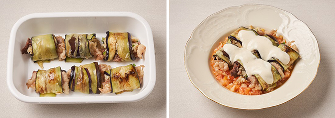 ⑤ 가지를 얇게 잘라 팬에 가볍게 굽고 ④를 올리고 돌돌 말아준다.