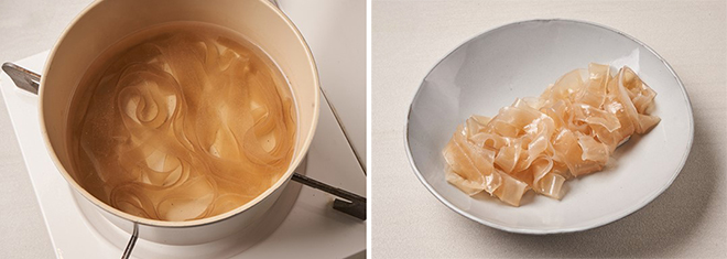 ③ 양장피 면은 끓는 물에 5분간 데치고, 같은 냄비에 건목이버섯을 데친다.