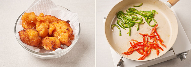 ② 붉은 파프리카와 피망은 올리브유에 살짝 볶는다.