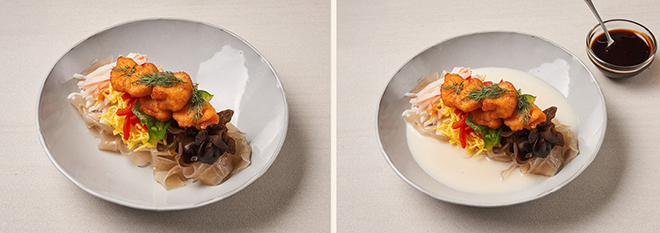 ⑤ 크래미, 데친 건목이버섯, 달걀지단을 면 위에 올리고, 튀겨낸 완자, 딜, 볶은 파프리카와 피망을 올린다.
