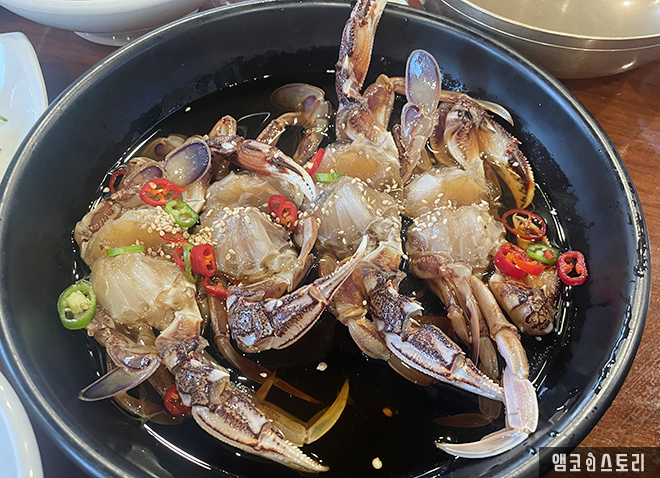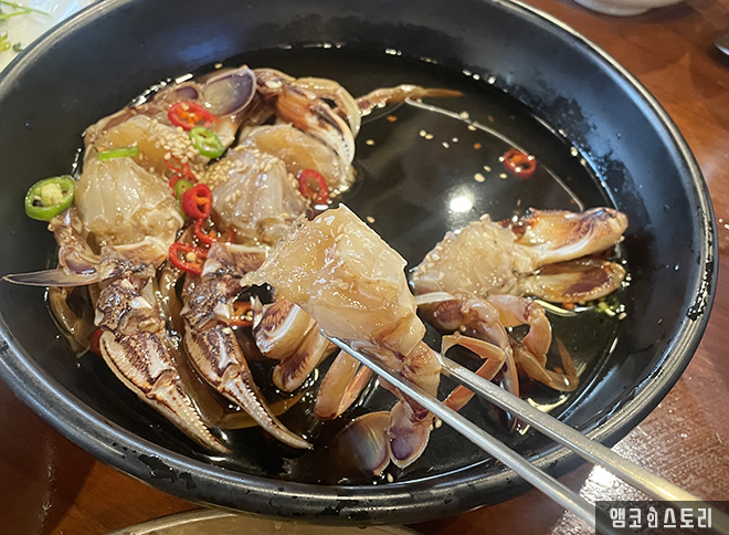 두 번째 메인 메뉴였던 간장게장 밥상입니다. 게장이 참 신선하고 살이 통통하고 푸짐했습니다. 적당히 잘 배어든 간장 양념 덕분에 짜지도 않고 감칠맛이 살아있었고, 밥을 멈출 수 없게 만드는 완벽한 밥도둑이었어요. 양도 제법 넉넉해서 푸짐하게 즐길 수 있었습니다.