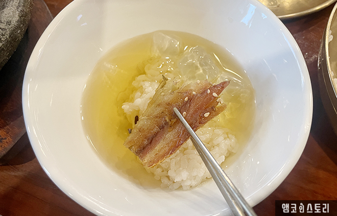 여기서 주목할 점은 차가운 녹차가 함께 나온다는 것인데요, 이 녹차는 그냥 마실 수도 있지만, 밥에 말아 굴비와 함께 먹는 전통적인 방식을 위한 녹차입니다. 밥을 녹차에 말아 굴비살을 올려 먹으면 입 안에서 은은한 풍미와 고소함이 어우러져 또 다른 맛을 느낄 수 있습니다.